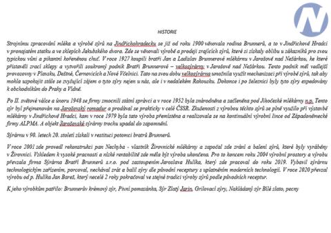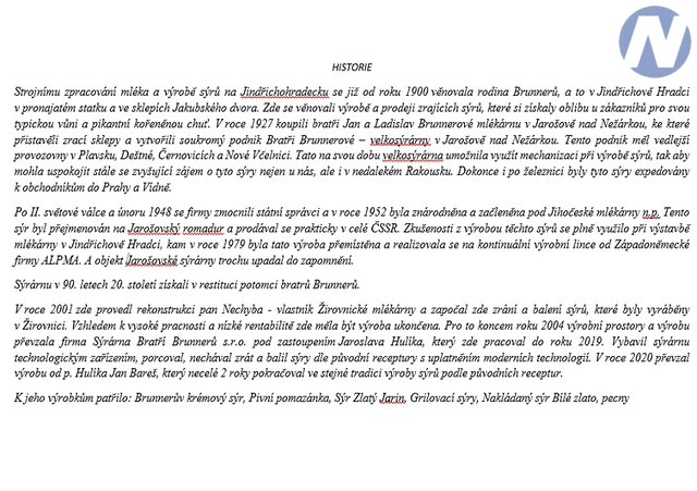 Ve výhradním zastoupení nabízím k prodeji výjimečný objekt – historickou sýrárnu s více než 120letou tradicí výroby sýra Romadur, která je v katastru nemovitostí vedena jako rodinný dům. Nemovitost se nachází v malebném městečku Jarošov nad Nežárkou, pouhých 8 km od Jindřichova Hradce. Právě zde vznikla v roce 1900 původní receptura na světoznámý Romadur. Budova ve tvaru písmene L o zastavěné ploše 645 m² leží přímo v centru obce a navazuje na ni pozemek o rozloze 2 025 m² s pohodlným přístupem a dalším rozvojovým potenciálem. Objekt je ve velmi dobrém technickém stavu a je napojen na elektřinu, obecní vodovod i kanalizaci. Ve zvýšeném přízemí se nachází byt 3+1, prodejna, kanceláře a výrobní prostory s možností různorodého využití. V suterénu objektu je mlékárenská výroba a původní zrací sklepy se stálou teplotou. Prostorné podkroví pak nabízí možnost vybudování dalších bytových jednotek. Tato jedinečná sýrárna představuje nadčasovou investici s bohatou historií a možností otevřít novou kapitolu podnikání. Doporučujeme ji zejména jako smysluplný podnikatelský záměr pro zájemce s vizí a chutí navázat na tradici poctivého řemesla. Pro více informací a sjednání prohlídky tohoto mimořádného objektu nás neváhejte kontaktovat. Koupi lze samozřejmě financovat hypotečním úvěrem, s jehož vyřízením Vám rádi pomůžeme.