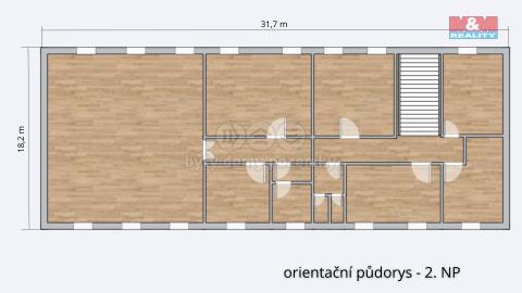 Nabízíme k prodeji komerční objekt na okraji města Horažďovice s výhledy na řeku Otavu a historické centrum. Zastavěná plocha činí 448 m², celková výměra pozemků je 5 346 m². Nemovitost je zkolaudovaná jako průmyslový objekt s platným povolením ubytovny v 1. patře. Má tři podlaží a rozsáhlé parkoviště. V přízemí se nachází čtyři prostorné garáže a skladovací prostory. První patro tvoří vrátnice, osm místností a sociální zařízení (sprchy, toalety). Ve druhém patře, které dříve sloužilo jako šicí dílna, je velká otevřená hala s dalšími sedmi místnostmi a sociálním zařízením. Budova je napojena na městský vodovod, plyn a elektřinu, s vlastní čističkou odpadních vod. Přístup zajišťuje vlastní příjezdová cesta se závorou. Výhodou je i možnost přístavby dalšího podlaží a zastavitelný pozemek. Nemovitost je vhodná jako investice nebo pro vlastní podnikání – ať už v oblasti ubytování, lehké výroby, nebo administrativy.