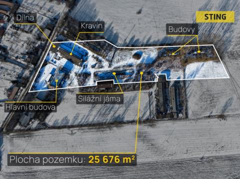 "Nabízíme k prodeji areál farmy v okrese Prostějov. Pozemky jsou v kategorii Ostatní plocha manipulační plocha o celkové výměře 26 446m2 (2,64ha) všechny v mém výlučném vlastnictví Pozemky jsou v územním plánu obce vedeny v kategorii „V" - prostory pro výrobu a skladování. Pozemky mezi budovami a kolem budov jsou panelové plochy. Součástí prodeje jsou následující stavby: ⬛ č.p.65 - čtyřpodlažní víceúčelová budova na st. parcele 90/5 s bytovými jednotkami a kancelářemi v přízemí, vyšší patra jsou vhodná pro adaptaci k bydlení či podnikání. Půdorys je 11,5m x36,7 metrů=422,05m2 x 4podlahy=1688,2m2 skladové či výrobní plochy. Budova je podsklepená. V zadní části je nákladní rampa s výtahem. kolem stavby jsou zpevněné plochy. Do budovy je zaveden plyn. Dispozice budovy: sklepy – sklad, kotelna přízemí - kanceláře, bytová jednotka, sklady 1 poschodí - sklady 2 poschodí – sklady Střecha budovy má hliníkovou krytinu a je v dobrém stavu. ⬛ budova sociálního zařízení na stavební parcele st.122 ⬛ st.parc. 109/7 - objekt 4řadého kravína s příslušenstvím, nepoužívaný – před rekonstrukcí, přední část budovy je adaptována na vytápěnou dílnu. ⬛ 70/7 - zahloubený betonový silážní žlab vedený v kategorii ostatní plocha zastavěná plocha 664m2 ⬛ st.132 - zemědělská stavba ocelová nádrž na LTO s betonovým základem Cena k jednání. Více informací u makléře. Do konce března 2026 nabízíme prostřednictvím našeho partnera úrokové sazby od 4,29 % p.a. Více informací Vám sdělí náš specialista na prohlídce.