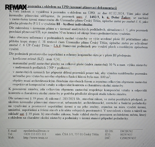Exkluzivně Vám nabízíme k prodeji stavební pozemek na okraji Českého Těšína, katastrální území Dolní Žukov. Pozemek o výměře 2326 m2 je v územním plánu určen k výstavbě rodinného domu. Tento mírně svažitý pozemek je ideální volbou pro ty, kteří hledají klidné bydlení nedaleko centra Českého Těšína. Je zde vyvedena přípojka elektřiny a vody. Poblíž pozemku se nachází i plyn. K pozemku vede zpevněná komunikace. Autobusová zastávka je 400 m.