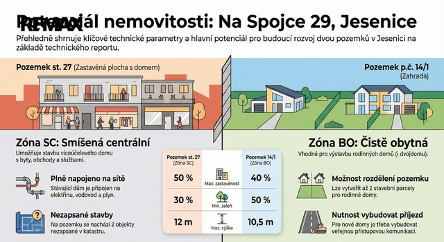 Nabízím k prodeji výjimečný investiční celek v atraktivní lokalitě Jesenice u Prahy, na adrese Na Spojce 29. Předmětem prodeje jsou dva stavební pozemky o celkové výměře 2 352 m², které jsou prodávány jako jeden funkční celek. Součástí nabídky je stávající rodinný dům, který je určen k demolici a jehož hlavní význam spočívá v napojení na inženýrské sítě a v umístění v rámci územního plánu. První pozemek o výměře 492 m² (parc. č. st. 27) je zastavěn rodinným domem č.p. 29 a nachází se v centrální části obce. Druhý pozemek o výměře 1 860 m² (parc. č. 14/1) je veden jako zahrada. Oba pozemky jsou dle platného územního plánu vedeny jako stavební a dohromady tvoří velmi zajímavou rozvojovou plochu s širokým spektrem využití. Pozemek se stávajícím domem spadá do funkční plochy smíšené centrální (SC), která umožňuje výstavbu polyfunkčního objektu, bytového domu nebo kombinaci bydlení s občanskou vybaveností, službami či administrativou. Maximální zastavěnost činí 50 % plochy pozemku, minimální podíl zeleně je 30 % a maximální výška stavby je stanovena na 12 metrů. Tato část pozemku má přímý kontakt s ulicí Na Spojce a je ideální pro komerčně-rezidenční projekt. Navazující pozemek parc. č. 14/1 o výměře 1 860 m² se nachází v ploše obecně obytné (BO). Je určen primárně pro výstavbu rodinných domů a nabízí možnost rozdělení na dvě samostatné stavební parcely, případně realizaci dvojdomu. Koeficient zastavění je zde maximálně 40 %, minimální podíl zeleně činí 50 % a maximální výška zástavby je 10,5 metru. Pro budoucí obsluhu rodinných domů je nutné vybudování nové přístupové komunikace. Stávající rodinný dům je napojen na elektřinu, plyn a vodovod. Veřejná kanalizace je v místě dostupná. Přístup k pozemkům je zajištěn z veřejné komunikace, která je ve vlastnictví města Jesenice. Napojení na inženýrské sítě výrazně zjednodušuje přípravu budoucí výstavby a snižuje vstupní investiční náklady. Lokalita Jesenice patří mezi dlouhodobě vyhledávané oblasti v bezprostřední blízkosti Prahy. Nabízí kompletní občanskou vybavenost, rychlé napojení na Pražský okruh i dálnici D0 a vysokou poptávku po bydlení i službách. Kombinace centrální smíšené zóny a obytné zástavby činí z této nabídky mimořádně zajímavou příležitost pro investora, developera nebo stavebníka s dlouhodobým záměrem. Tento celek umožňuje realizaci projektu s vysokým potenciálem zhodnocení, a to jak formou polyfunkční výstavby, tak rezidenčního bydlení. Jedná se o strategickou nabídku, která se v této lokalitě objevuje jen výjimečně Těším se na setkání a společnou prohlídku.