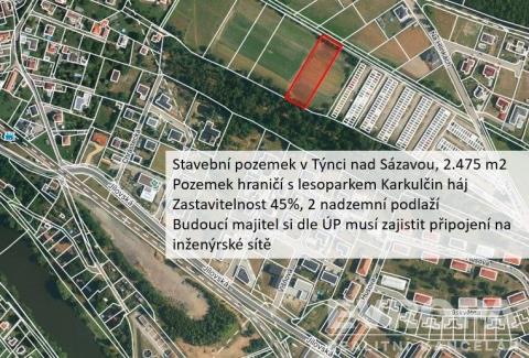 Exkluzivně nabízíme stavební pozemek určený pro bydlení o rozloze 2475 m². Pozemek se nachází v severozápadní části Týnce Sázavou a hraničí s místním lesoparkem. Pozemek je rovinatý, což usnadňuje případnou výstavbu a snížení nákladů na zemní práce. Dle územního plánu se jedná o stavební pozemek pro bydlení venkovského typu, zastavitelnost 45%, výška max.2 nadzemní podlaží. Územní plán počítá s rozvojem celé této lokality, a to včetně připojení na inženýrské sítě. Přístup na pozemek je po soukromé komunikaci, která je územním plánem definována jako tzv. dopravní infrastruktura jistota příjezdové cesty. Pozemek je prodáván od místního majitele. Mezi pozemkem a centrem města Týnec je krásný lesopark Karkulčin háj. Pokud hledáte místo s dostatkem prostoru, krásnou přírodou a v bezprostřední blízkosti centra malebného městečka, jste správně. Týnec nad Sázavou je i díky zlepšení dopravní dostupností (dostavba D3) jedním z rychle se rozvíjejících měst. Rezidenční charakter a klidné prostředí vhodné pro rodiny s dětmi nebo pro ty, kteří hledají útočiště před ruchem velkých měst. Pozemek zaručuje i v budoucnu dostatek klidu jedinečná stezka lesoparkem tzv. Karkulčin háj, vede přímo pod tímto pozemkem krásné místo s venkovním fitness a dětským hřištěm. Ať už si přejete stavět dům svých snů nebo jen hledáte vhodné místo pro investici do nemovitostí, tento pozemek vás jistě osloví svými možnostmi a potenciálem.