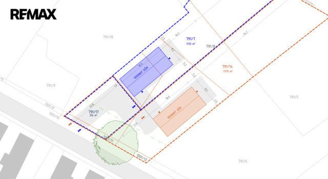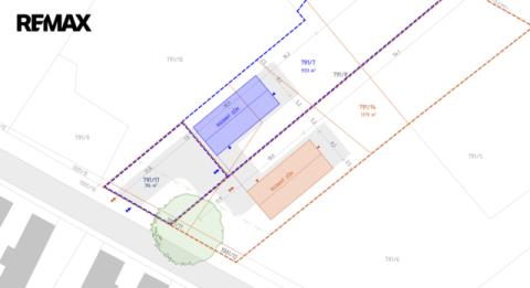 Ve fotogalerii najdete i geometrický plán s možností umístění samostatných domů na nabízeném pozemku a vedlejším pozemku parc. č. 791/7, který byl prodán na konci loňského roku.