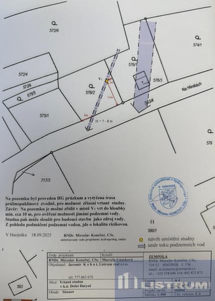 Nabízíme k prodeji velmi pěkný stavební pozemek o výměře 522 m2, který je dle platného územního plánu v zóně SV, tedy určen k bydlení v rodinných domech. Celý pozemek je mírně svažitý, čtvercového půdorysu, s výhledem na panorama Beskyd včetně Lysé hory a do okolí. Na pozemku stojí původní dřevěná stavba chatky. Pozemek přímo sousedí s asfaltovou silnicí, sjezd na pozemek tedy přímo z této cesty. Pozemek je možno napojit na elektřinu (vedení NN vede po druhé straně silnice), vedení plynovodu (vedení plynu vede po druhé straně silnice). Na pozemku je již zřízena kanalizační přípojka. Napojení na vodovodní řad možné není z důvodu jeho vzdálenosti a přístupu přes několik soukromých pozemků. Za tím účelem byl proveden HG průzkum, kdy bylo zjištěno, že na pozemku je podzemní zdroj vody pro studnu, viz. foto. Zásadní výhodou pozemku je jeho umístění ve velmi žádané lokalitě, v klidné a velmi pěkné části měsa Havířov, části Dolní Datyně, ulice Na Hlinkách. Vynikající dopravní dostupnost včetně MHD (250 m). Veškeré další info u makléře.