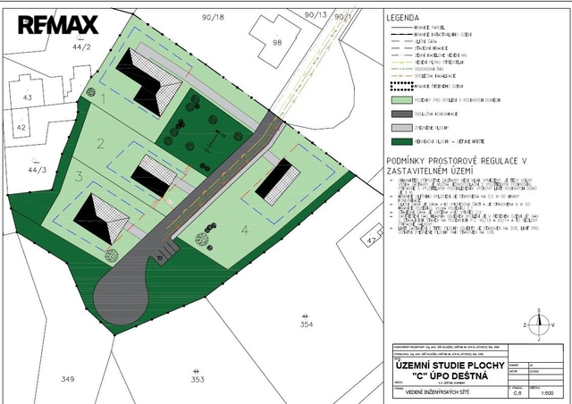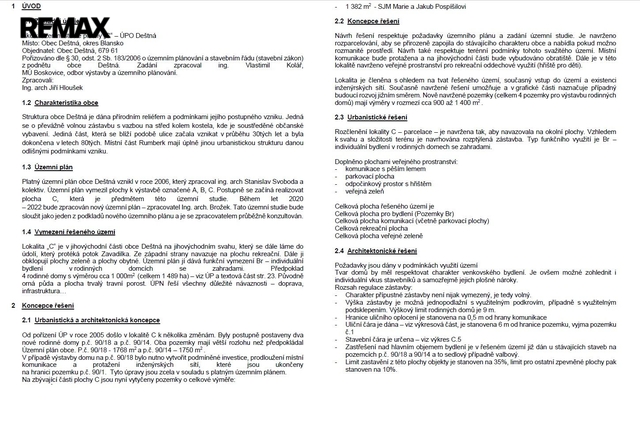 Celková plocha nabízeného souboru 2 pozemků je 6.002 m2, nyní jsou pozemky definované jako trvalý travní porost a jedná se o mírně svažité udržované travnaté plochy, které jsou volně přístupné z veřejné komunikace. Nabízené pozemky jsou v souladu s územním plánem obce součástí tzv. Plochy "C" (funkční vymezení Br), na kterou byla vypracována samostatná studie a na základě které zde územní plán umožňuje individuální bydlení v rodinných domcích se zahradami. Předpokládají se zde až 4 rodinné domy s výměrou cca 1 000 m2 na pozemcích s označením 1, 2, 3, 4. Na pozemku č.1 již započala stavba domu. Lokalita „C“ je v jihovýchodní části obce Deštná na mírném jihovýchodním svahu, který se dále láme do údolí, kudy protéká potok Zavadilka. Ze západní strany navazuje na plochu rekreační. Dále ji obklopují plochy zeleně na jihu a plochy obytné na severu. Jihovýchodní hranice pozemku je nově vytyčená.