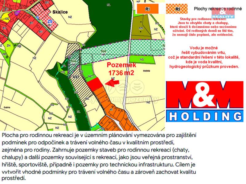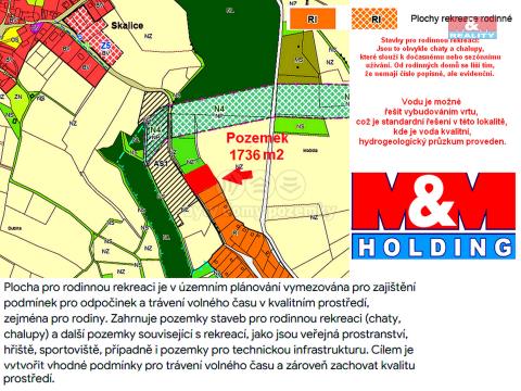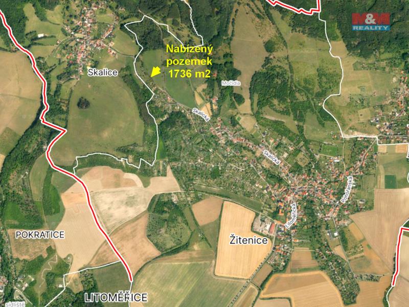 Prodej výjimečného pozemku v klidné lokalitě u Litoměřic. Nabízíme k prodeji exkluzivní pozemek o rozloze 1736 m² v atraktivní lokalitě mezi Žitenicemi a Skalicí, jen 6 minut od Litoměřic. Mírně svažitý pozemek orientovaný na jih nabízí krásné výhledy a dostatek soukromí. Přímý přístup z veřejné asfaltové komunikace. Co se týče inženýrských sítí, dle územního výkresu, elektřina je k dispozici na hranici pozemku, což značně usnadňuje připojení. Vodu možnost řešit vybudováním vrtu, což je standardní řešení v této lokalitě, kde je voda kvalitní, hydrogeologický průzkum proveden. Na pozemku můžou stát chaty nebo chalupy se zastavěnou plochou (včetně terasy, chodníků apod.) do 85 m² a výškou 1 NP + podkroví. Lokalita je známá svou tichou atmosférou a krásnými výhledy na okolní krajinu. Tento pozemek se hodí nejen pro rekreační účely, ale i pro stavbu malé chatky nebo chalupy, jak stanovuje územní plán. Skvělá příležitost pro ty, kteří hledají klidné místo v přírodě blízko města.
