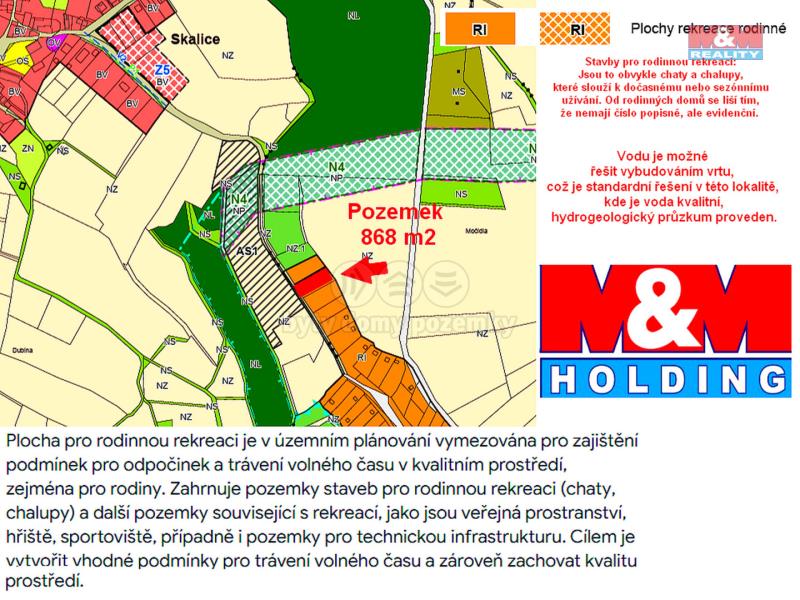 Prodej výjimečného pozemku v klidné lokalitě u Litoměřic. Nabízíme k prodeji exkluzivní pozemek o rozloze 868 m² v atraktivní lokalitě mezi Žitenicemi a Skalicí, jen 6 minut od Litoměřic. Mírně svažitý pozemek orientovaný na jih nabízí krásné výhledy a dostatek soukromí. Přímý přístup z veřejné asfaltové komunikace. Co se týče inženýrských sítí, dle územního výkresu, elektřina je k dispozici na hranici pozemku, což značně usnadňuje připojení. Vodu možnost řešit vybudováním vrtu, což je standardní řešení v této lokalitě, kde je voda kvalitní, hydrogeologický průzkum proveden. Na pozemku může stát jedna chata nebo chalupa se zastavěnou plochou (včetně terasy, chodníků apod.) do 85 m² a výškou 1 NP + podkroví. Lokalita je známá svou tichou atmosférou a krásnými výhledy na okolní krajinu. Tento pozemek se hodí nejen pro rekreační účely, ale i pro stavbu malé chatky nebo chalupy, jak stanovuje územní plán. Skvělá příležitost pro ty, kteří hledají klidné místo v přírodě blízko města.