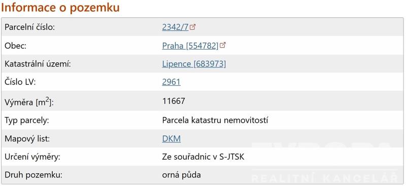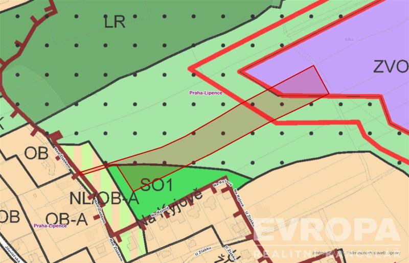 Nabízíme k prodeji strategický pozemek v pražských Lipencích s celkovou výměrou 11 667 m². Tato parcela představuje výjimečnou příležitost pro investory hledající plochy pro komerční rozvoj v těsné blízkosti klíčového dálničního tahu na jih Čech. Hlavní přednosti a potenciál: • Budoucí produkční zóna: Podle nového Metropolitního plánu (lokalita 633 / Lipence rozvoj) je menší část pozemku (cca 3 000 m²) definována jako zastavitelná stavební plocha se způsobem využití „produkční“. • Široké možnosti využití: Po nabytí účinnosti nového plánu (předpoklad 2026) bude plocha určena pro lehkou výrobu, skladování, logistické zázemí či administrativní objekty. • Strategická poloha: Území je situováno u sjezdu ze silnice I/4 (Strakonická), což zajišťuje perfektní logistickou dostupnost pro nákladní i osobní dopravu. • Rozvoj infrastruktury: V lokalitě se plánuje významné posílení technického zázemí, včetně výstavby nového vodojemu Lipence II. Podrobnosti k územnímu plánu: • Současný stav: Aktuálně je pozemek v katastru veden jako orná půda. V platném územním plánu spadá menší část do kategorie ZVOC (ostatní) a větší do ZMK (zeleň městská krajinná). • Budoucí stav (Metropolitní plán): Menší část se mění na produkční areál s cílem podpořit vznik pracovních míst a hospodářský rozvoj lokality. Větší část pozemku zůstává nezastavitelnou zelení, což budoucímu areálu zajistí přirozený přírodní odstup a odclonění. Investiční doporučení: Tento pozemek je ideální volbou pro firmy hledající prostor pro vlastní sídlo, sklady nebo lehkou výrobu s výborným napojením na Pražský okruh. Vzhledem k probíhajícímu schvalování Metropolitního plánu se jedná o investici s vysokým potenciálem zhodnocení v blízkém horizontu. Upozornění: Pozemek není určen k rezidenční výstavbě (rodinné domy).