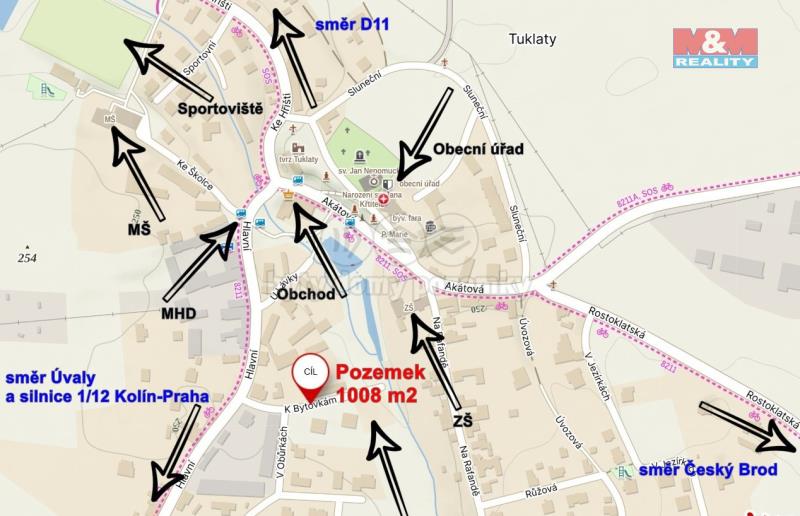 Nabízíme k prodeji rovinatý pozemek o výměře 1008 m², vedený jako zahrada, v klidné části obce Tuklaty nedaleko centra. Pozemek je oplocen betonovým plotem s automatickou elektrickou bránou a má zajištěn příjezd po obecní komunikaci. K dispozici je vlastní studna, přípojka elektřiny, poblíž veřejná kanalizace. V územním plánu je veden jako zeleň sídelní soukromá. V obci je základní a mateřská škola, sportoviště, dětská hřiště, obchod i restaurace. Okolí nabízí bohaté možnosti pro volnočasové aktivity – turistiku, cykloturistiku, návštěvu zooparku či kulturní a sportovní vyžití v blízkých Úvalech. Ideální místo pro relax, zahradničení a pobyt v přírodě s rychlou dostupností do Prahy. Veškerá občanská vybavenost je v Úvalech (3 km), na Černý Most je to 20 km. Spojení zajišťuje autobus i vlak, přímý dojezd na Masarykovo nádraží trvá cca 30 minut. Zajímavá investiční příležitost. Pro více informací nás kontaktujte.