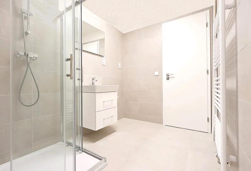 V předsíni a koupelně keramická dlažba, v pokoji vinylová podlaha.