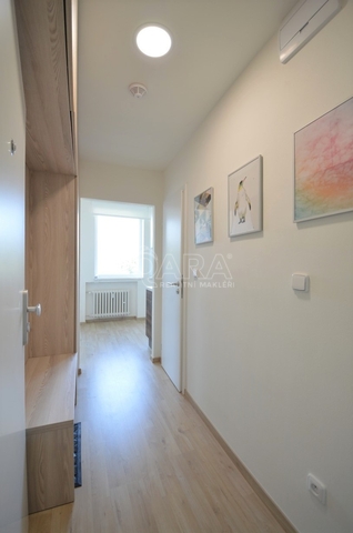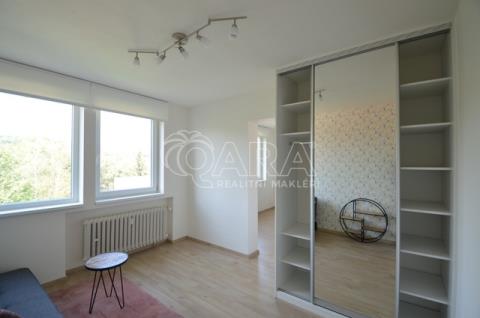 Světlé a příjemné 1+1 se sklepem a s celkovou výměrou 31,8 m2, se nachází v pátém patře domu s výtahem v unikátním projektu V bloku, ulice Peroutkova, Praha 5, Jinonice. Nabízí samostatný pokoj s vestavěnou skříní a rozkládací pohovkou, průchozí pokoj s kuchyňským koutem, jídelním stolem a židlemi, předsíň s úložnými prostory, koupelnu s vanou a toaletou. Orientace na západ s otevřeným výhledem do zeleně. Vestavěná kuchyňská linka na míru, zařízená kvalitními spotřebiči, indukční deska, odsávací digestoř, lednice s mrazákem, myčka a mikrovlnka. K dispozici je sklep 1,2 m2.