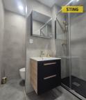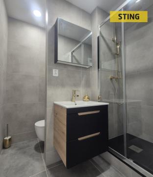 • Moderní koupelna se sprchovým koutem, umyvadlovou skříňkou, zrcadlem a částečně odděleným WC.