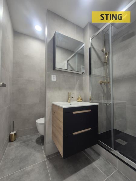 • Moderní koupelna se sprchovým koutem, umyvadlovou skříňkou, zrcadlem a částečně odděleným WC.