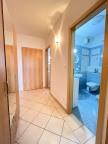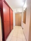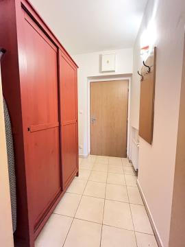 Po vstupu z pavlače do bytu vstupními dveřmi se ocitneme v prostorné předsíni, kde jsou šatní skříně pro uložení věcí. Z předsíně vedou dveře do všech místností v bytě. Hned u hlavních dveří bytu je vstup do kuchyně s kuchyňskou linkou, elektrickým sporákem, troubou a také lednicí (ta je v bytě na dožití).