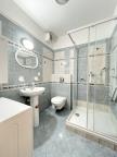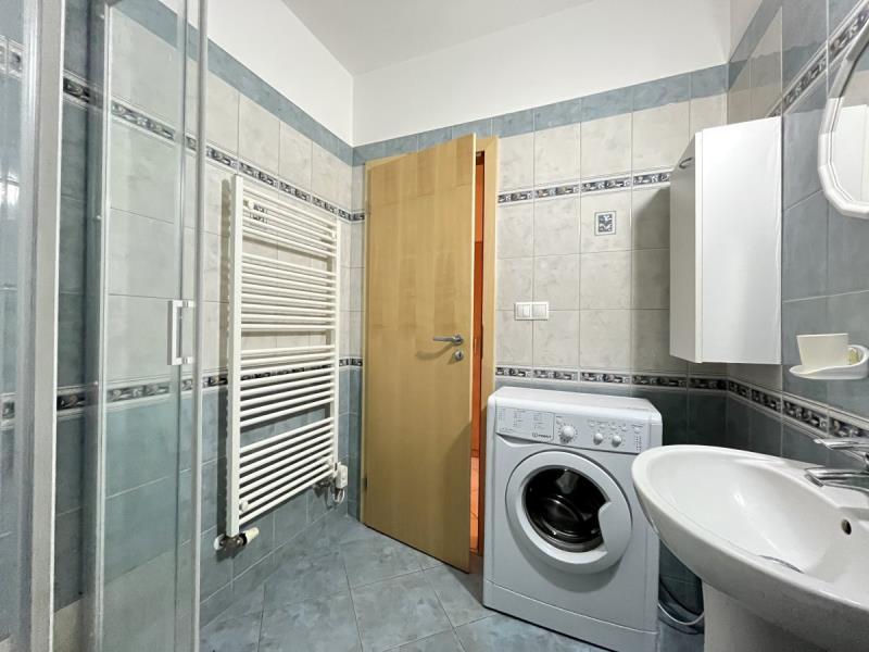 Z předsíně se také dostaneme do prostorné zrekonstruované koupelny s WC. Zde nalezneme sprchový kout, WC, umyvadlo se zrcadlem, skříňku, otopný žebřík a menší pračku (ta je v bytě také na dožití).