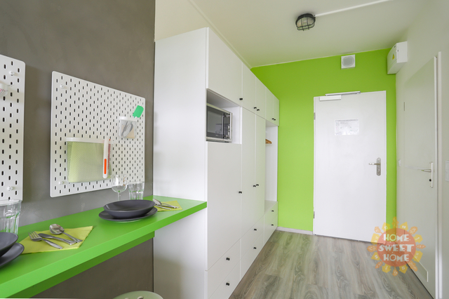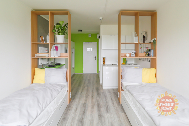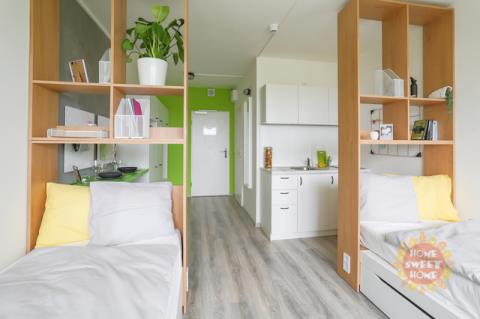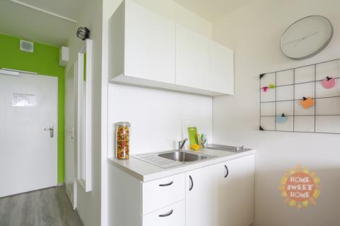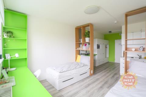 Nabízíme k pronájmu studentské sdílené bydlení pro dvě osoby ve studiu o rozloze 18 m² v rezidenčním třípodlažním domě s výtahem v ulici Kotlaska, Praha 8 - Palmovka. Tato lokalita vyniká skvělou dopravní dostupností. Rezidence poskytuje mnoho společných prostor k vyžití. Vhodné především pro studenty. Studio bylo navrženo s důrazem na maximální využití prostoru a funkčnost. Součástí studia je plně vybavená vlastní kuchyňská linka (lednice, varná deska, mikrovlnná trouba, digestoř), koupelna se sprchovým koutem a toaletou, dvě lůžka s matracemi 90x200cm, dostatek úložného prostoru, pracovní deska. Vybavení bytu je velmi kvalitní a přispívá k příjemnému bydlení. Vysokorychlostní internet je samozřejmostí a je již zahrnut v ceně poplatků. Rezidence poskytuje plné vyžití pro volnočasové aktivity, tak pro společné setkávání a budování komunity. V budově naleznete fitness centrum (vybavená posilovna a venkovní fitness zázemí), natáčecí a hudební místnost, herna s pingpongovým stolem a kulečníkem, venkovní grilování, prádelna (za příplatek) a společná prostorná kuchyně s jídelním koutem. Toto bydlení je ideální volbou pro studenty, kteří hledají kvalitní a dostupné ubytování v blízkosti škol a dalších důležitých bodů v Praze. Rezidence se nachází pouhých 5 min. od stanice metra linky B - Palmovka. V rezidenci nabízíme více pokojů, pro jednotlice či páry – skutečný vzhled pokoje se může lišit v závislosti na konkrétním designu. Konkrétní typ pokoje, jeho umístění a patro budou upřesněny na základě vaší poptávky, včetně termínu a délky pobytu.Minimální doba pronájmu jsou tři měšíce. Uvedená cena je včetně veškerých poplatků (elektřina, voda, topení, vysokorychlostní internet a využívání společných prostor). Cena za lůžko pro 1 osobu vč. poplatků EUR 550. Studio je vhodné maximálně pro dvě osoby. V případě zájmu o prohlídku či více informací nás neváhejte kontaktovat.