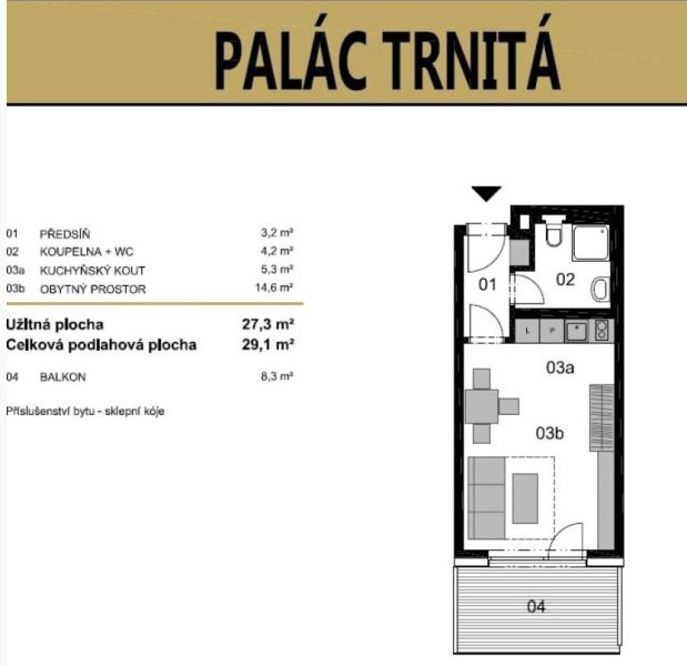 Dispozice: předsíň 3,2 m², koupelna + WC 4,2 m², kuchyňský kout 5,3 m², obytný prostor 14,6 m² (celkem 29,1 m² + balkon 8,3 m² sklepní kóje)
