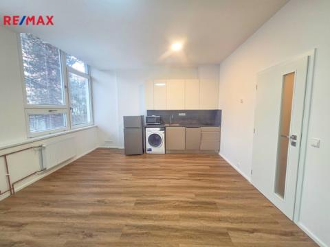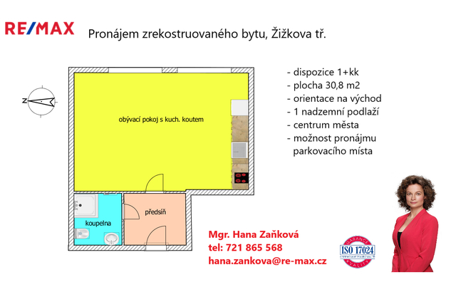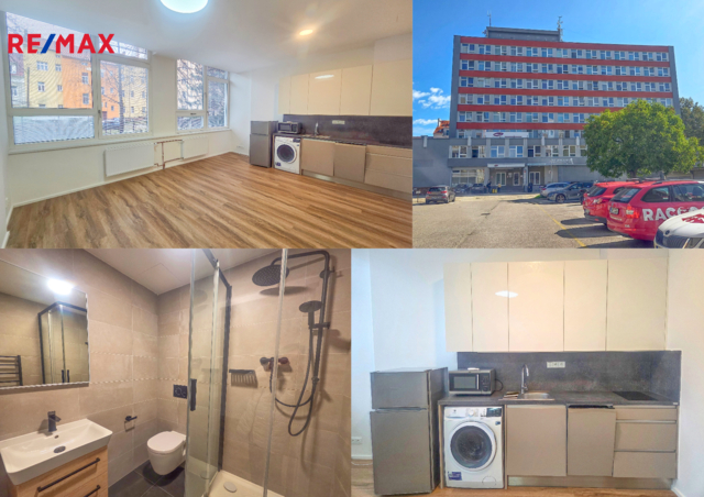 Nabízíme k pronájmu zrekonstruovaný byt 1+kk, umístěný v 1 NP multifunkční budovy s výtahem v žádané lokalitě v blízkosti centra města v ulici Žižkova. Byt s dispozicí 1+kk (30,8 m2) je situován v nově kompletně zrekonstruovaném multifunkčním domě v klidném vnitrobloku, v lokalitě s veškerou občanskou vybaveností, skvělou dostupností MHD a v centru města. Do bytu se vstupuje předsíní (4 m2), ze které je vstup do pokoje s kuchyňským koutem a do koupelny. Pokoj s kuchyňským koutem o ploše 22 m2 je orientován na východ a je osazen kuchyňskou linkou s dřezem, sklokeramickou varnou deskou, troubou, myčkou, pračkou, mikrovlnnou troubou a ledničkou s mrazákem. Koupelna má plochu 4,8 m2 a je osazena sprchovým koutem, umyvadlem, otopným žebříkem a WC. V případě potřeby je k dispozici recepce v areálu. V případě zájmu lze k bytu pronajmout parkovací místo na dvoře domu za 1.452,- Kč/měsíc Byt je vhodný pro pracující nekuřáky bez domácích mazlíčků. Nájemné 10.800,- Kč + zálohy na energie (elektřina, voda, teplo) a služby 3.394,- Kč/měs. Vratná kauce 28.388,- Kč. Poplatek RK pouze 5.800,- + 21% DPH neboť část poplatku hradí pronajímatel Byt volný ihned.