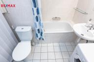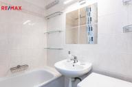 Součástí čisté a udržované koupelny je vana, umyvadlo, zrcadlová skříňka, pračka, skleněné poličky a drátěné doplňky pro koupelnové potřeby. Dále toaleta a prostorná policová skříň skrytá vertikálními žaluziemi.