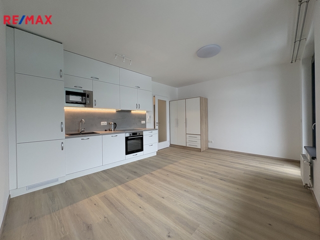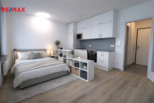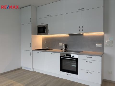 Hlavní obytná místnost se zastřešeným balkónem a na míru řešenou kuchyňskou linkou (s vestavěnými elektrospotřebiči – horkovzdušnou troubou, mikrovlnnou troubou, digestoří, sklokeramickou varnou deskou, vestavěnou lednicí a samostatným mrazákem, osvětlením pracovní desky) poskytne svému novému uživateli vše potřebné - doplněny budou garnyže nad okny + záclona, pod umyvadlová skříňka a koupelnové zrcadlo + varná konvice. Další vybavení bytu je na nájemci a jeho představě (po domluvě lze případně dokoupit pračku/sušičku, i postel).