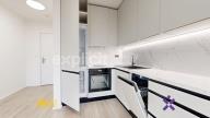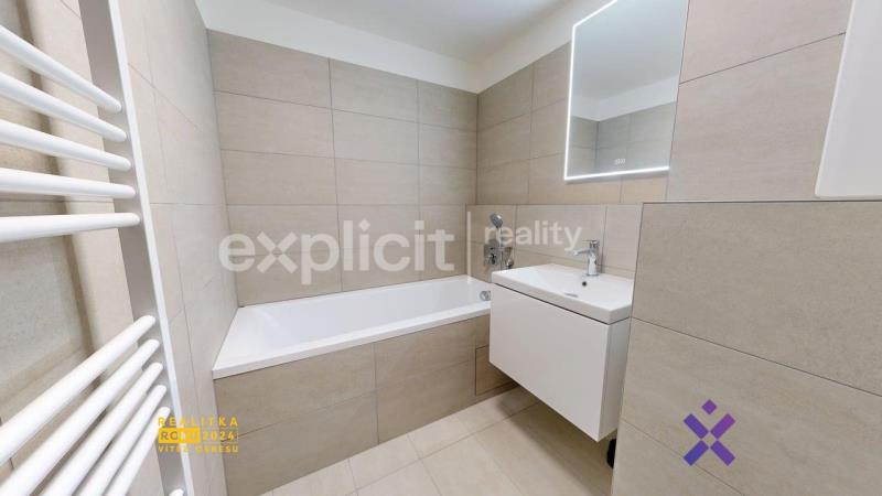 Kuchyňský kout je účelně navržen a plně osazen moderními spotřebiči, mezi které patří indukční varná deska, trouba, mikrovlnná trouba, myčka nádobí a lednice s mrazákem. Součástí vybavení bytu je rovněž pračka. Koupelna je řešena v moderním stylu, vybavena vanou, keramickými obklady a sanitou kvalitních značek.