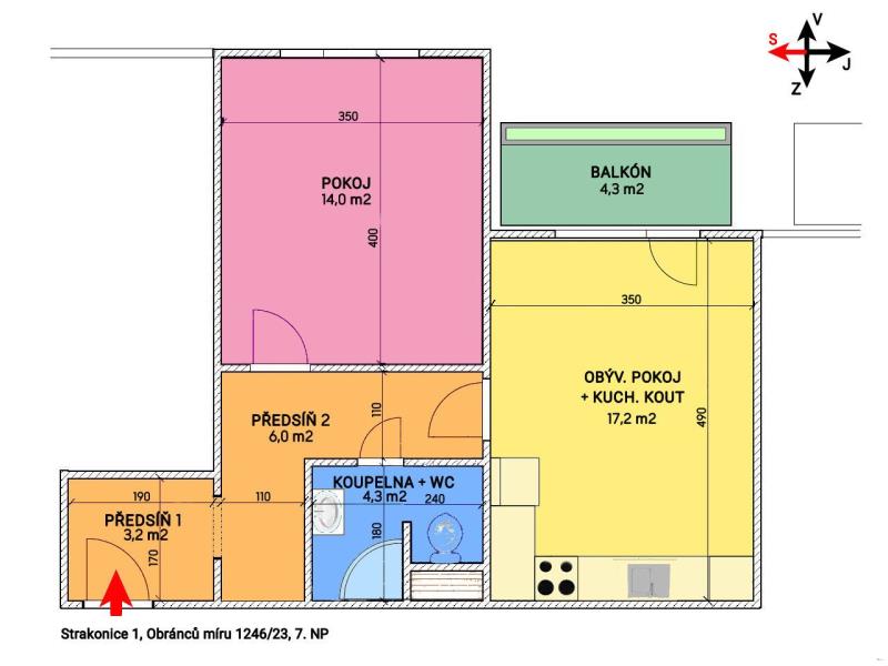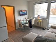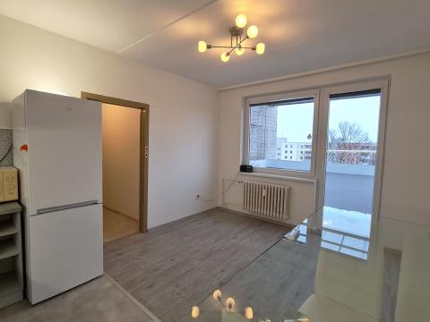 Hledáme nájemce pro dlouhodobý pronájem částečně zařízeného bytu po kompletní rekonstrukci 2+kk, 49 m2 v 7. podlaží panelového domu v ulici Obránců míru č.p. 1246. Dispozice - obývací pokoj s kuch. koutem (17,2 m2) a balkónem (4,3 m2), pokoj (14,0 m2), koupelna se sprchovým koutem a WC (4,3 m2), vstupní předsíň (3,2 m2) a druhá předsíň (6,0 m2). Podlahy v pokojích a kuchyni vinyl, ostatní místnosti (i balkón) dlažba. Okna plastová se žaluziemi, orientovaná na východ do vnitrobloku se zelení. Kuchyňská linka je vybavená velkou chladničkou s mrazákem, el. sporákem s varnou deskou, digestoří s odtahem, MW troubou, myčkou a varnou konvicí. V koupelně je pračka. Další vybavení - skleněný jídelní stůl, předsíňové skříně a botník, dvojlůžko (dle dohody),... Dispozice bytu je zřejmá z přiloženého půdorysu a vybavení z fotografií. PENB - D.