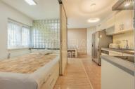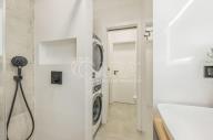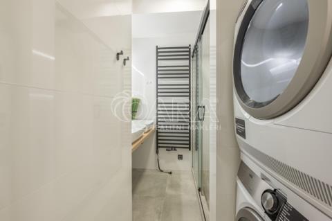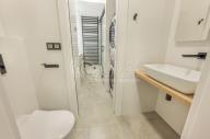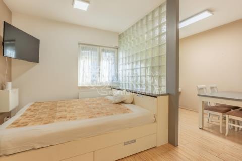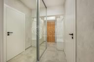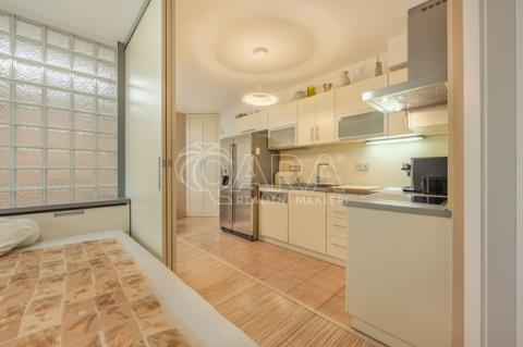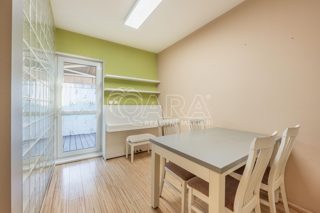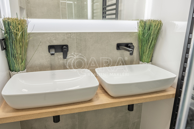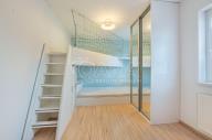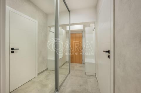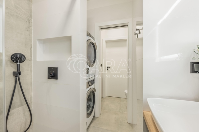 Vstupní chodba je vybavena vestavěnými skříněmi, které poskytují dostatek úložného prostoru. Koupelna disponuje sprchovým koutem, toaletou, dvěma umyvadly. Součástí vybavení je pračka i sušička. Kuchyňský kout s jídelní částí je řešen na míru a plně vybaven spotřebičemi – lednicí, sklokeramickou varnou deskou, troubou, mikrovlnnou troubou a kávovarem. Plynule navazuje na obytný prostor, který lze pomocí posuvných dveří oddělit a vytvořit tak samostatnou ložnici. Ložnice je dále oddělena designovou skleněnou příčkou z luxfer, která propouští denní světlo a zároveň zajišťuje maximální soukromí. Veškerý nábytek je vestavěný a navržen tak, aby byt bylo možné ihned plnohodnotně užívat bez nutnosti dalšího zařízení. Další pokoj, rovněž vybavený vestavěným nábytkem, je ideální jako dětský pokoj. K bytu náleží také zasklená lodžie o velikosti 4 m², která sloužila jako klidná pracovna. Na lodžii je instalována klimatizační jednotka, která v letních měsících byt příjemně ochladí a v zimě umožňuje přitápění, což výrazně zvyšuje komfort bydlení po celý rok.
