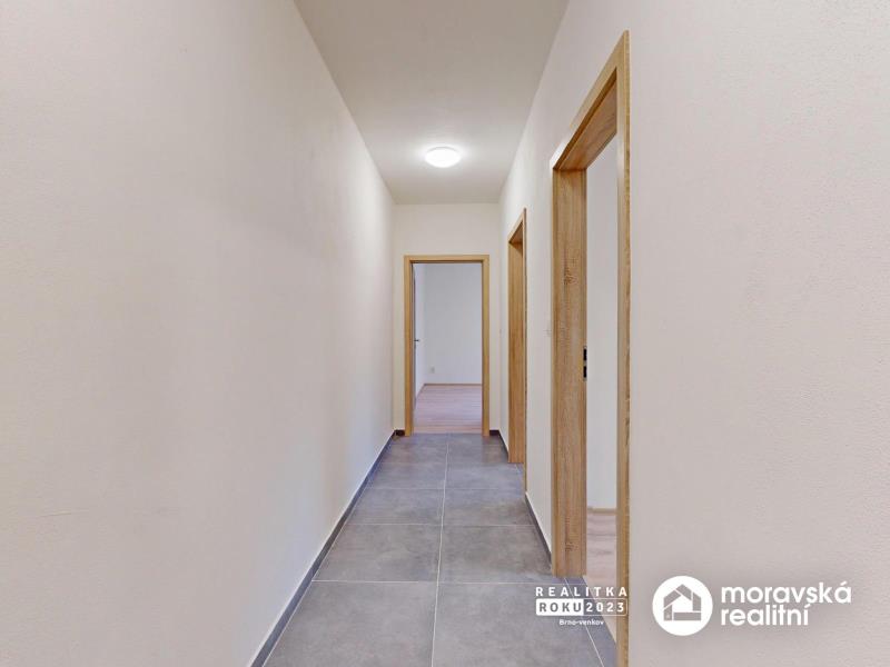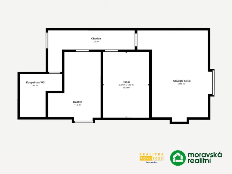 - Chodba (7,61m2), koupelna s WC (5,4m2), kuchyně (10,56m2), ložnice (11,57m2), obývací pokoj (19,78m2)
