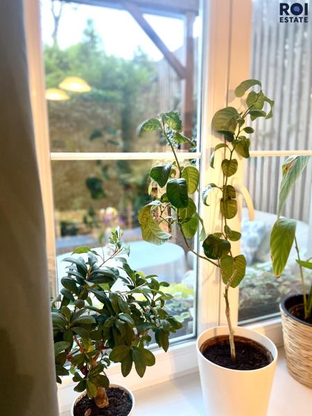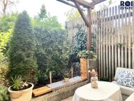 Francouzským oknem se z kuchyně dostaneme přímo na terasu, která je oddělena od zahrady vzrostlými keři, je zastřešena, osvětlena a zařízena dřevěným regál, sedačka rohová, konferenční stolek lze ji využít celoročně. Opravdu oáza, na kterou navazuje upravená zahrada, kterou je možné také využívat. Rozloha venkovních částí 20m2 terasa + 340m2 zahrada.