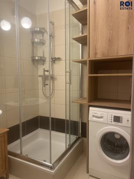 Koupelna se sprchovým koutem, vestavěná skříň, pračka Bosch a plynový kotel Baxi. Toaleta samostatně.