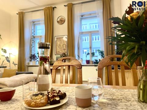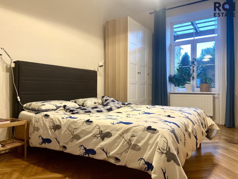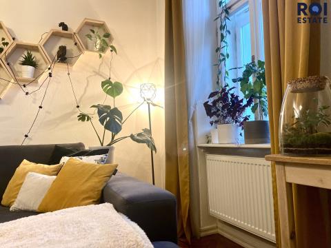 Byt před časem prošel rekonstrukcí, ale jsou zde zachovány původní prvky, které k tomuto typu domu prostě patří. Obývací pokoj má orientaci do ulice Merhautova, ale díky protihlukových sklům je zde klid. Ložnice je orientovaná do zahrady.