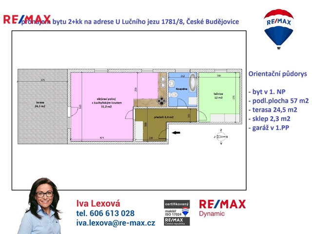 Byt je dispozičně řešený jako 2+kk o celkové ploše 83,7 m2. Podlahová plocha je 57 m2, součástí bytu je terasa s jižní orientací o výměře 24,5 m2, sklep 2,3 m2 a prostorná garáž (21 m2) umístěná v suterénu domu.