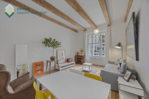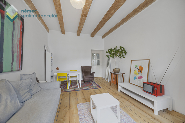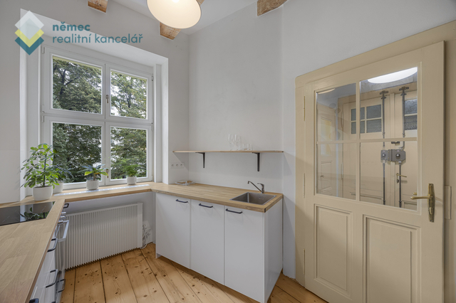 Světlý a citlivě renovovaný byt s přihlédnutím na přírodní materiály a okny jak do vnitrobloku, tak do klidné ulice je kompletně zařízen nábytkem.