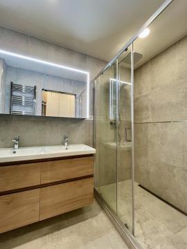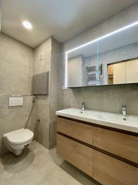Koupelna nabízí velmmi prostorný sprchový kout, dvě umyvadla, toaletu a bidetovou sprchu.