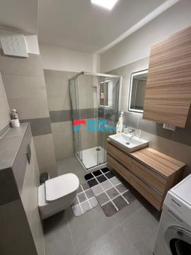 V koupelně, která je spojená s toaletou se nachází velký sprchový kout, pračka se sušičkou opět Miele, a elektrický kotel. Na chodbě jsou je prostor dokonale využitý vestavnými skříněmi a botníkem.