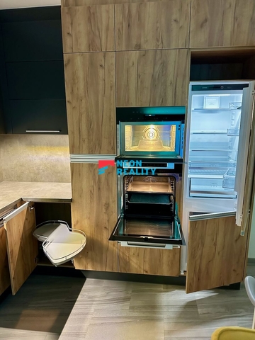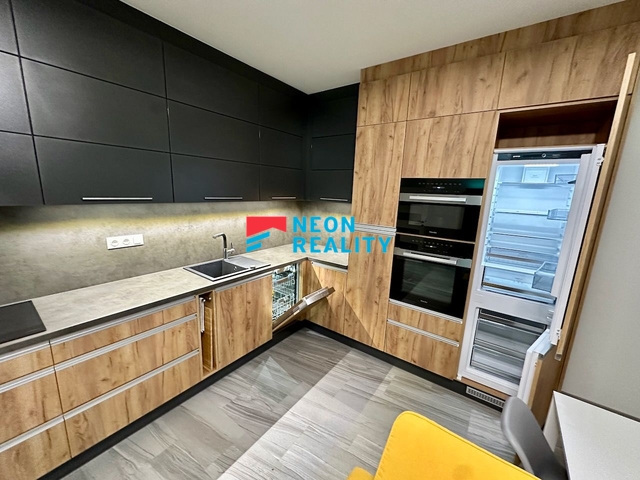 Obývací pokoj s kuchyní kde se nachází prostorná značková kuchyňská linka se spotřebiči Miele (trouba, varná deska, myčka, digestoř, lednice, mikrovlnka). Velmi kvalitní materiály včetně výklopných pantů, dojezdů a dorazů.