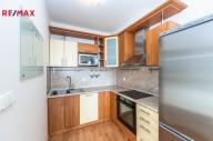 Součástí vybavení je kuchyňská linka se spotřebiči (myčka, sklokeramická deska, elektrická trouba, digestoř, mikrovlnná trouba, lednice s mrazákem), jídelní stůl se čtyřmi židlemi a několik poliček v obývacím pokoji. V koupelně se nachází topný žebřík, umyvadlová skříň i zrcadlová skříňka a nechybí přípojka na pračku. Lodžie je vybavena dvěma křesly a stolkem. V předsíni stojí botník a věšáková stěna, v komoře jsou osazené police.