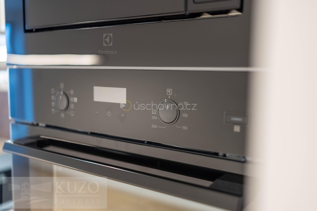 V bytě je podlahové vytápění, elegantní vinylové podlahy, rekuperace v pobytových místnostech a velkoformátová okna s trojskly.