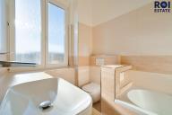 Koupelna je s oknem, vybavená pračkou kombinovanou se sušičkou, vanou.