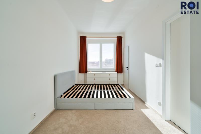 Ložnice s postelí a úložnými prostory, komora, kterou lze využít i jako šatnu nebo pracovnu.