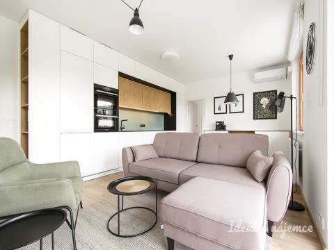 K dlouhodobému podnájmu nabízíme nový designový byt v rezidenčním objektu Koivu developera YIT ve vyhledávané lokalitě Praha - Zličín. Objekt byl vystaven v roce 2018, od té doby je byt ve vlastnictví prvních majitelů, byl využívaný pouze příležitostně. Byt o dispozici 2+Kk a podlahové ploše 58m2 s jihozápadní orientací se nachází ve druhém patře novostavby a nabízí se s garážovým parkovacím stáním a sklepem. Nabízí se plně vybavený bez možnosti odstranění jednotlivých kusů nábytku. Kuchyňská linka na míru disponuje všemi potřebnými spotřebiči - vestavěnou kuchyňskou linkou, myčkou, indukční varnou deskou, elektrickou troubou, mikrovlnkou a digestoří. V obývacím pokoji nalezneme sedačku, křeslo s podnožkou a televizní stolek s televizí. Jídelní část disponuje stolem s židlemi. Prostorná ložnice disponuje manželskou postelí s novými matracemi a nočními stolky. Celý byt lemují štědré úložné prostory. Kvalitní vestavěný nábytek je z rukou studia 23PM. Energetická kategorie B. Byt pronajímá Ideální nájemce - služba, se kterou budete bydlet bezstarostně a za férových podmínek. Když se něco přihodí, k dispozici jsou správci, kteří s vámi vše vyřeší. Pomůžeme s veškerou administrativou, s nastavením plateb a zajistíme vám speciální pojištění. Pojďte bydlet s námi!