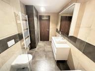 Koupelna je vybavena vanou, umyvadlem s prostornou skříňkou, toaletou a dostatkem místa pro pračku a sušičku.