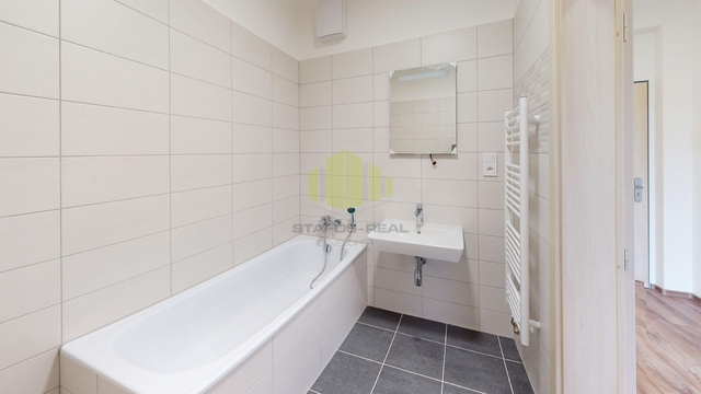 Kuchyňský kout je vybaven kuchyňskou linkou s indukční varnou deskou, elektrickou troubou, přípravou na myčku nádobí a samostatně stojící lednicí s mrazákem. V koupelně se nachází vana, umyvadlo, otopný žebřík a příprava pro pračku. Byt se pronajímá nevybavený, s výjimkou kuchyňské linky a spotřebičů.