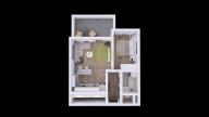 Byt se nachází v 1. nadzemním podlaží, má podlahovou plochu 55,5 m² a disponuje prostornou lodžií o výměře 11,4 m², přístupnou z obývacího pokoje. Celková plocha bytu činí 66,9 m². Byt je orientován na východ a jeho dispozice zahrnuje obývací pokoj s kuchyňským koutem, ložnici, vstupní halu, velkorysou šatnu, koupelnu a samostatné WC.
