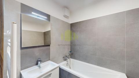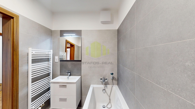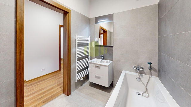 Kuchyňský kout je vybaven kuchyňskou linkou s indukční varnou deskou, elektrickou troubou, přípravou na myčku nádobí a samostatně stojící lednicí s mrazákem. V koupelně se nachází vana, umyvadlo, otopný žebřík a příprava pro pračku. Byt se pronajímá nevybavený, s výjimkou kuchyňské linky a spotřebičů.