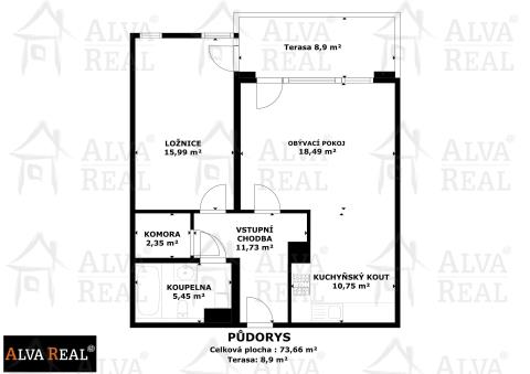 Dispozice: vstupní chodba 11,75 m², ložnice 15,99 m², obývací pokoj s kuchyňským koutem 29,24 m², koupelna 5,45 m², šatna/komora 2,35 m², sklep. Výměry jsou měřeny pomocí zařízení Matterport a jsou orientační.