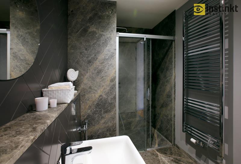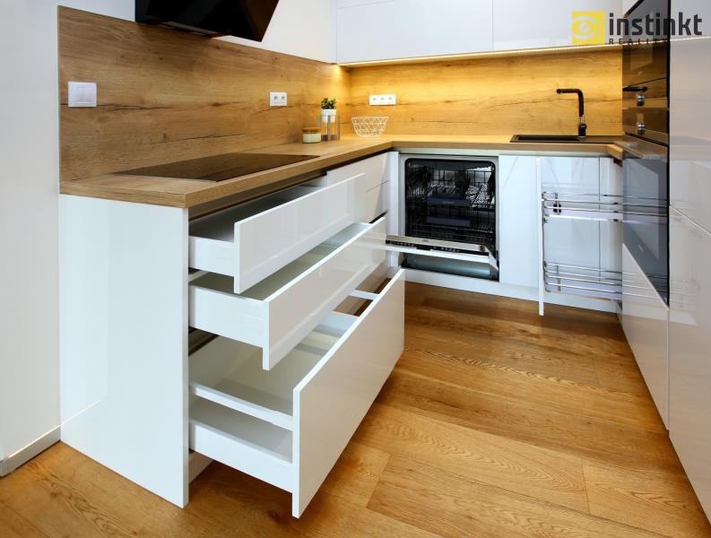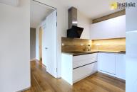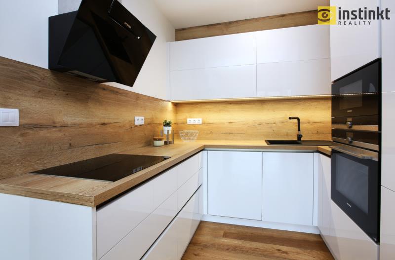 Hlavní obytný prostor (29,4 m²) propojuje kuchyňský kout, jídelní část a obývací pokoj. Kuchyňská linka je plně vybavena vestavnými spotřebiči. Ložnice (15,6 m²) s přímým vstupem na terasu a s vlastní šatnou, ke které přiléhá koupelna. Koupelna je vybavena sprchovým koutem, toaletou a prostorem pro pračku se sušičkou a má podlahové vytápění. V bytě druhá samostatná toaleta umístěna u předsíně. Předsíň s vestavěnou skříní se zrcadlem.