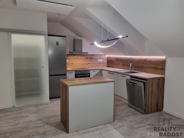 Kuchyňská linka je ve tvaru L, vybavená spotřebiči - myčka, sklokeramická varná deska, elektrická trouba, digestoř, lednice.