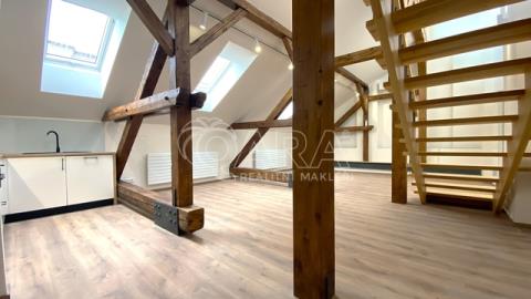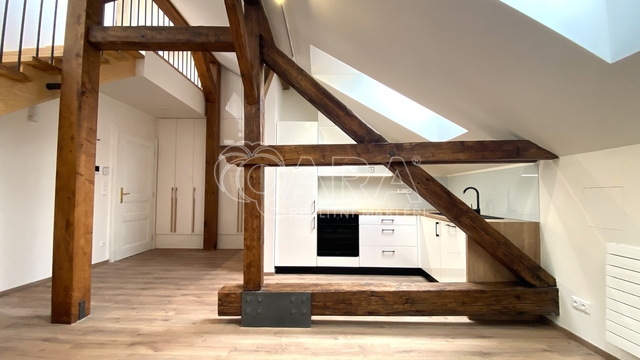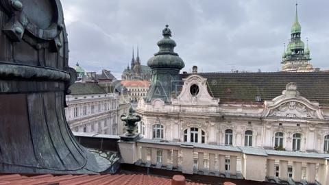 Chcete se chlubit opravdu originálním a luxusním bydlením v centru Brna, s perfektním výhledem, které vám budou závidět i ti nejlepší kamarádi? Tak právě pro vás je k pronájmu atraktivní mezonetový byt o velikosti 2+kk s užitnou plochou 87 m2, situovaný v prestižní lokalitě v úzkém centru Brna, na ulici Orlí. Tento atypický a prostorný byt se nachází ve 5. patře (s výtahem) nádherného historického domu, který prošel velmi pečlivou a precizní rekonstrukcí se zaměřením na každý, i ten nejmenší detail. Byt vás nadchne svou vzdušností a důmyslně řešeným prostorem, který je ideální pro moderní životní styl. Vnitřní dispozice zahrnuje dvě příjemné obytné místnosti propojené schodištěm. Vybavení bytu zahrnuje klimatizaci a vlastní plynový kondenzační kotel, zajišťující nejen příjemnou teplotu během letních veder, ale také efektivní vytápění v zimních měsících. Součástí vybavení je také kuchyňská linka s moderními vestavěnými spotřebiči. Jedním z hlavních lákadel této nemovitosti je impozantní výhled přes střešní věže na Zelný trh a Petrov. Druhý výhled jiným směrem je z prostorné terasy, o rozloze 10 m². Tohle je zase ideální místo pro relaxaci při šálku kávy či večerním posezení. Důležitým aspektem je také dostatek úložného prostoru, což ocení každý, kdo hledá komfortní bydlení. Součástí bytu jsou také 2 WC, což přispívá k praktičnosti každodenního užívání. Sprcha je v umístěna v horním podlaží bytu. Lokace bytu v centru Brna zajišťuje výbornou dostupnost MHD a blízkost ke všem důležitým službám a kulturním atrakcím. Tento mezonetový byt představuje kombinaci moderního bydlení a historického kouzla města Brna. Vhodné pro max 2 osoby (případně dítě). Volné ihned. V případě zájmu o prohlídku nás neváhejte kontaktovat.