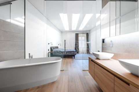 Pronájem designového, špičkově vybaveného luxusního bytu, 3kk, 186m2 v 1. patře nákladně rekonstruované residence. Lokalita v srdci metropole je perfektně dostupná MHD, autem i na kole a nabízí překvapivě klidné a příjemné městské bydlení se všemi službami v bezprostřední blízkosti.